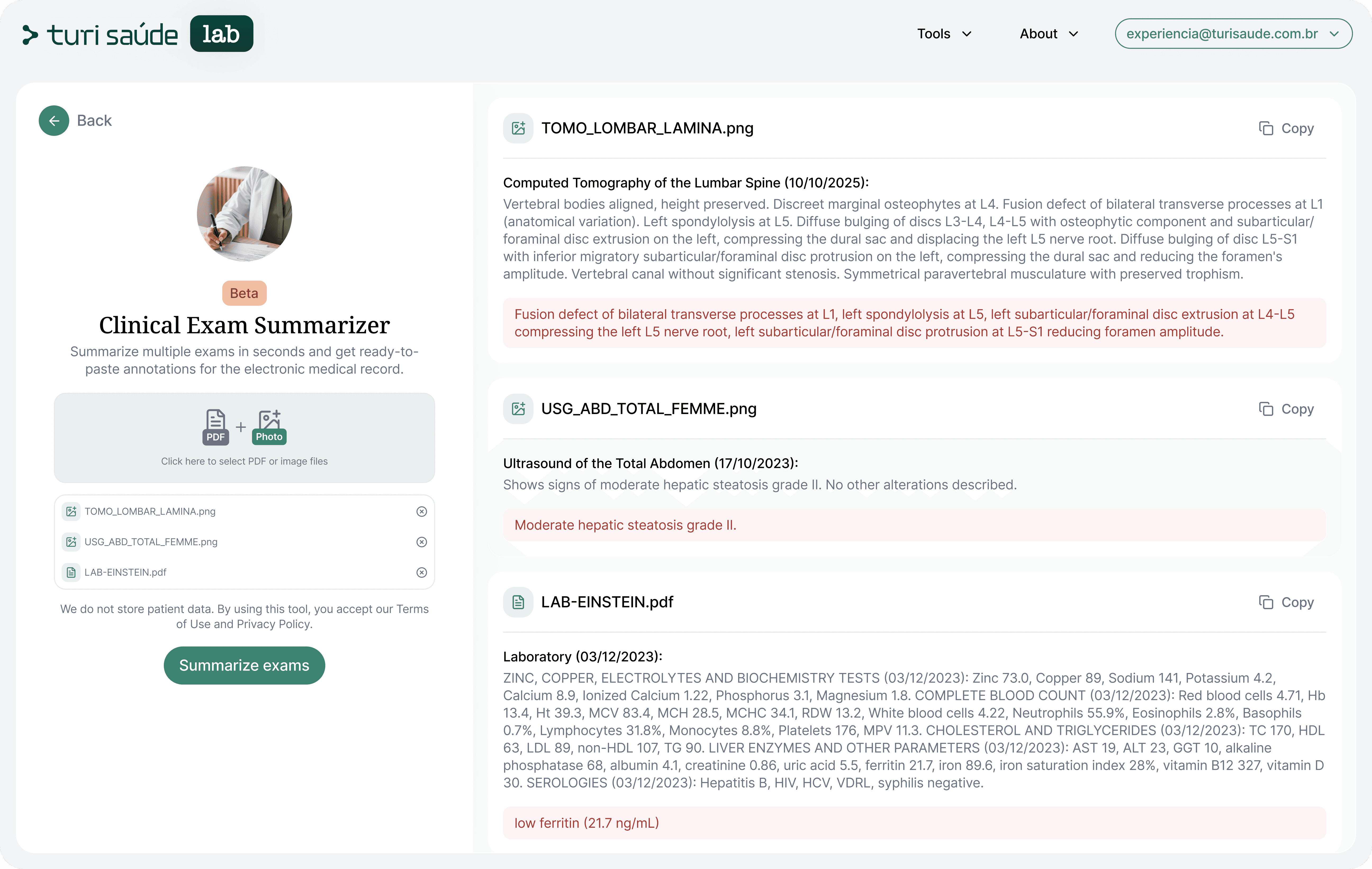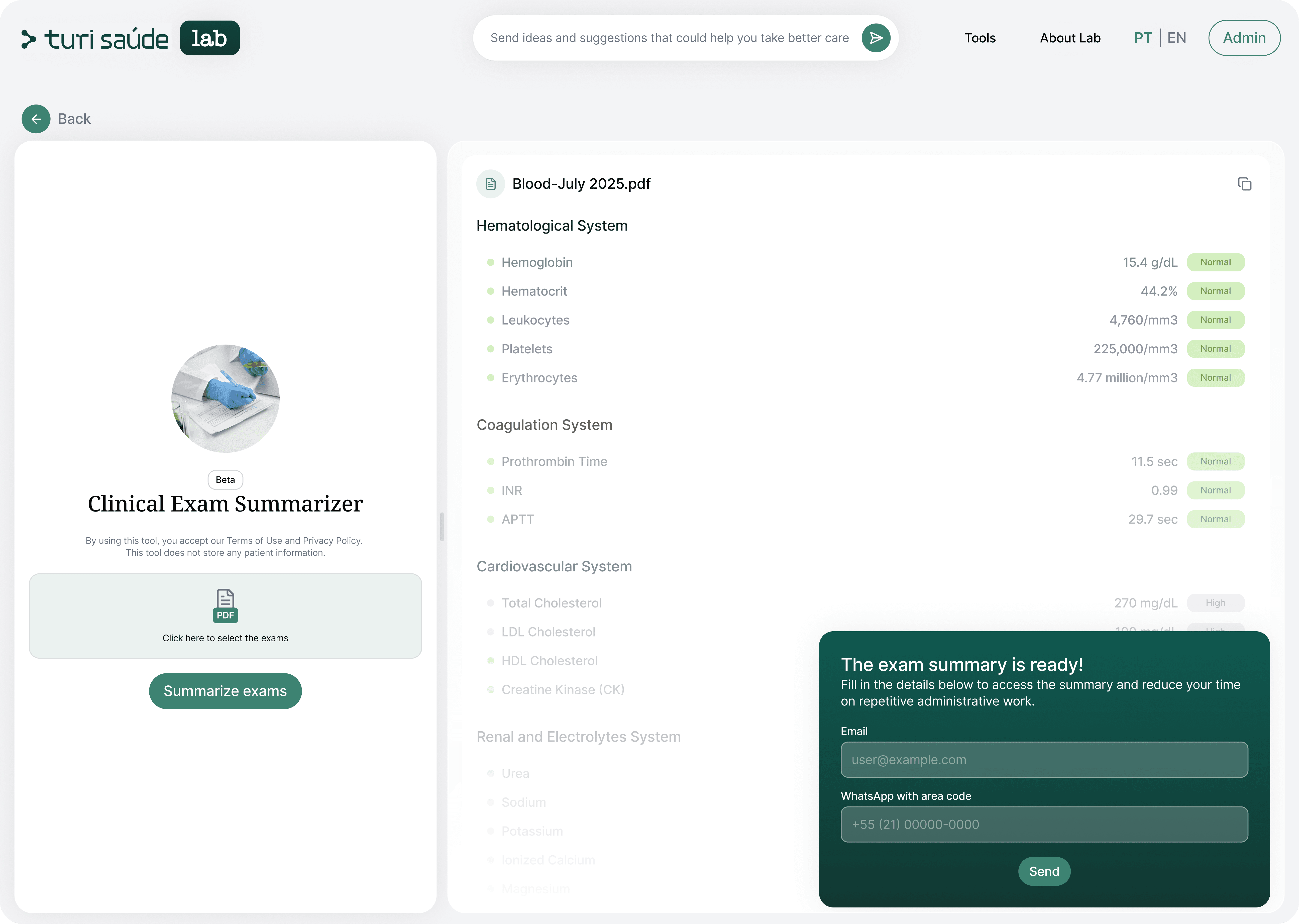 Lab tests and imaging exams are a core part of clinical diagnosis, yet in Brazil results often reach physicians in lengthy, fragmented, non-standardized formats that require manual review, data extraction, and documentation in electronic health records (EHRs).
