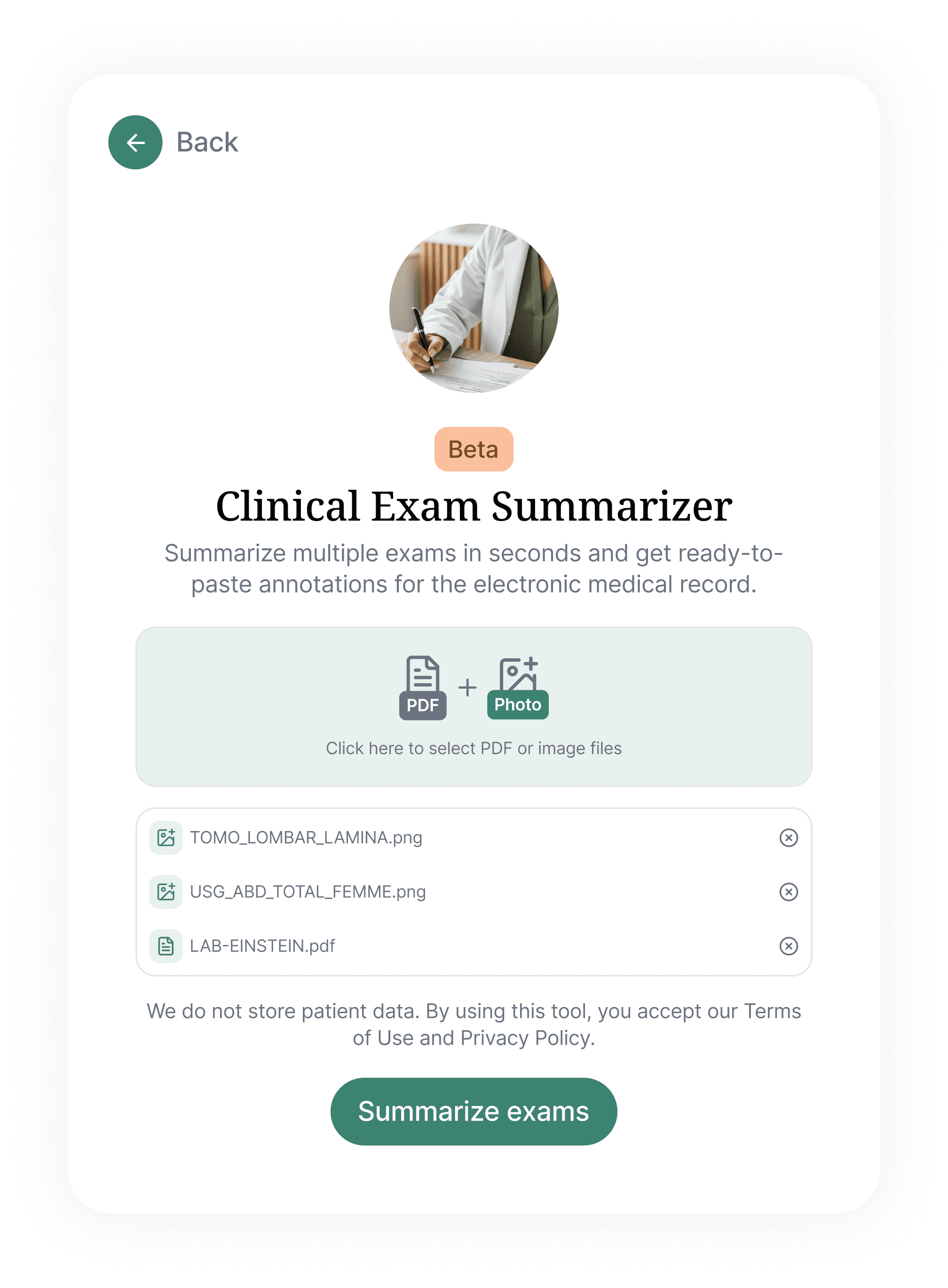 The first tool, Clinical Exam Summarizer, focused on structuring multi-page PDFs into synthesized, ready-to-use clinical annotations with one click.